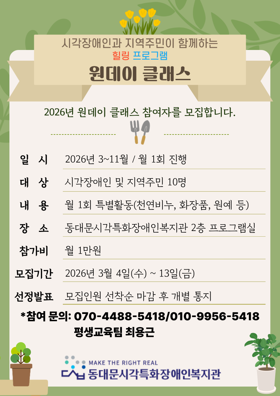 2026년 동대문시각특화장애인복지관에서는 시각장애인 및 지역주민을 위해 원데이클래스를 진행합니다.