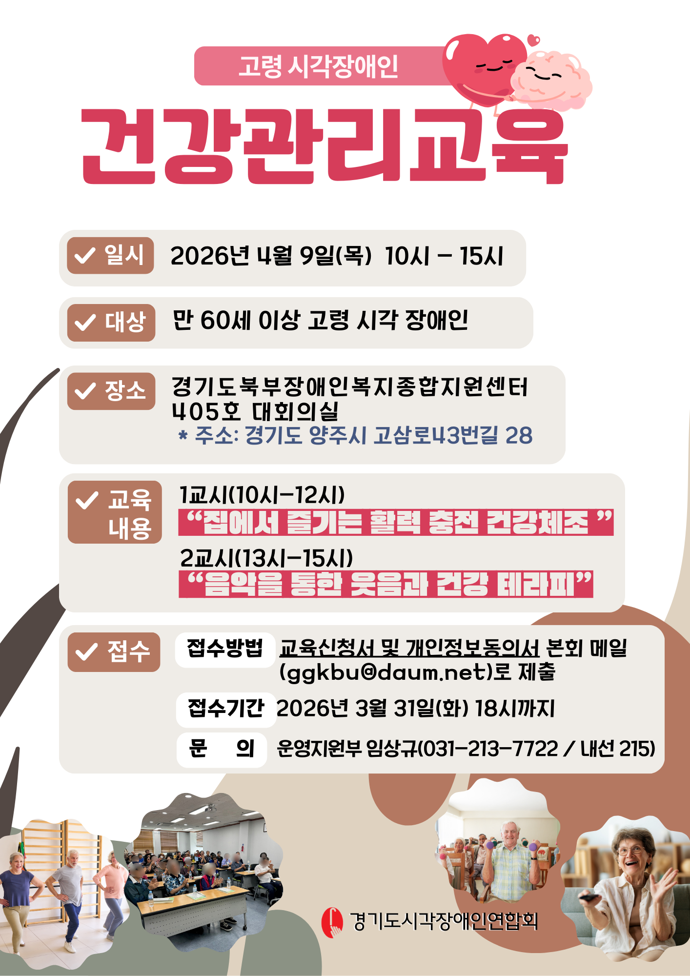 사단법인 경기도시각장애인연합회에서는 경기도에 거주하는 고령 시각장애 어르신의 신체적·정서적·사회적 역량강화와 자존감 향상, 사회참여의 기회 확대를 지원하기 위해 건강관리교육사업을 진행하고 있습니다. 아래와 같이 교육 참가자를 모집하오니 많은 분들의 관심과 참여바랍니다.